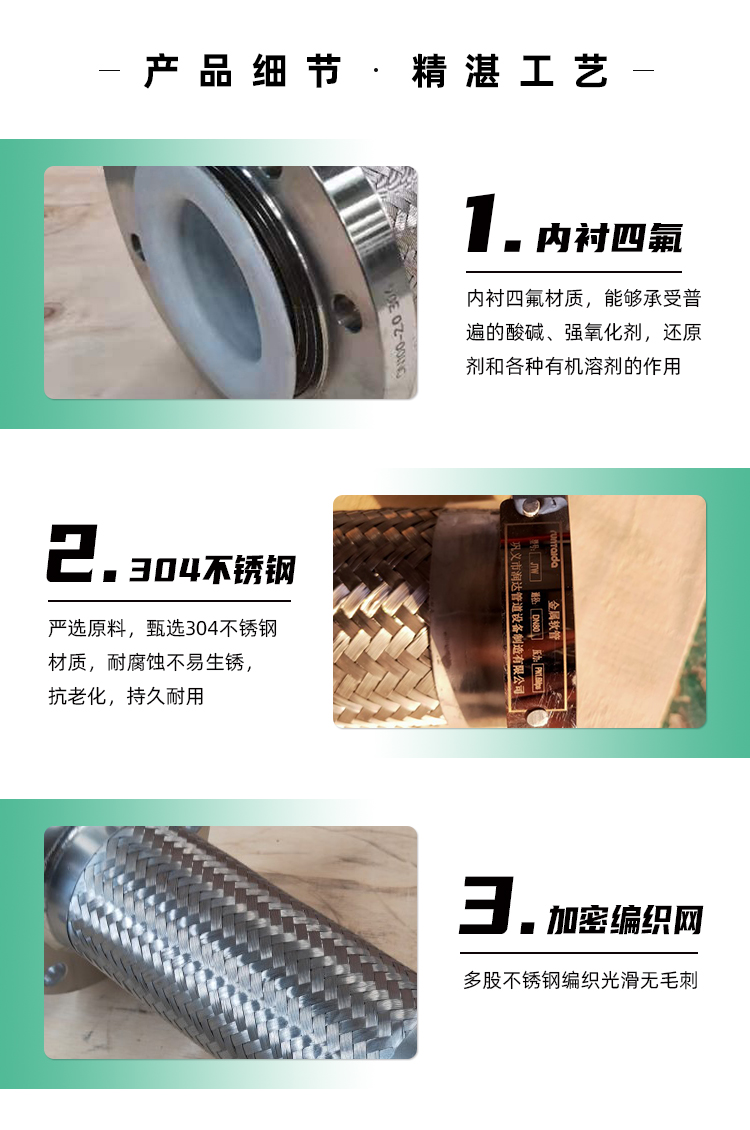 1.金屬軟管整體采用1Cr18Ni9Ti不銹鋼材料制成,具有較強的耐腐蝕能力。